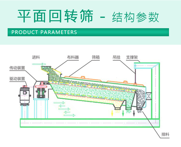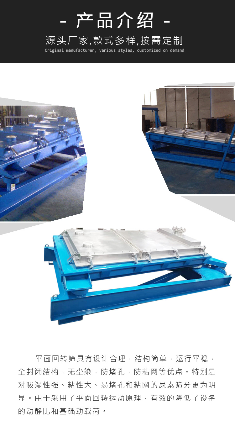 平面回轉篩相比于傳統直線振動篩,篩分效率進一步提升,其采用了平面回轉運動的原理,降低了設備的動靜比和基礎動載荷,篩分面積更大,噪音更小,篩網壽命更長,廣泛應用于化工、建材、糧食等行業。