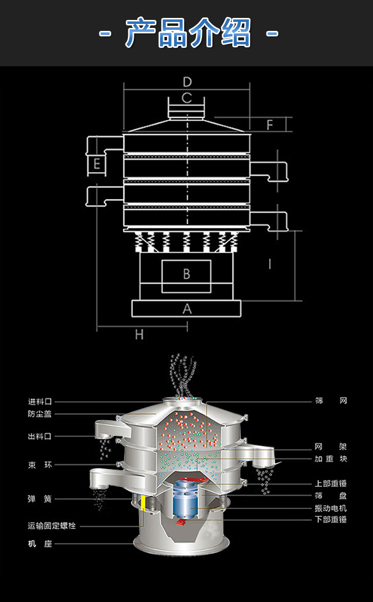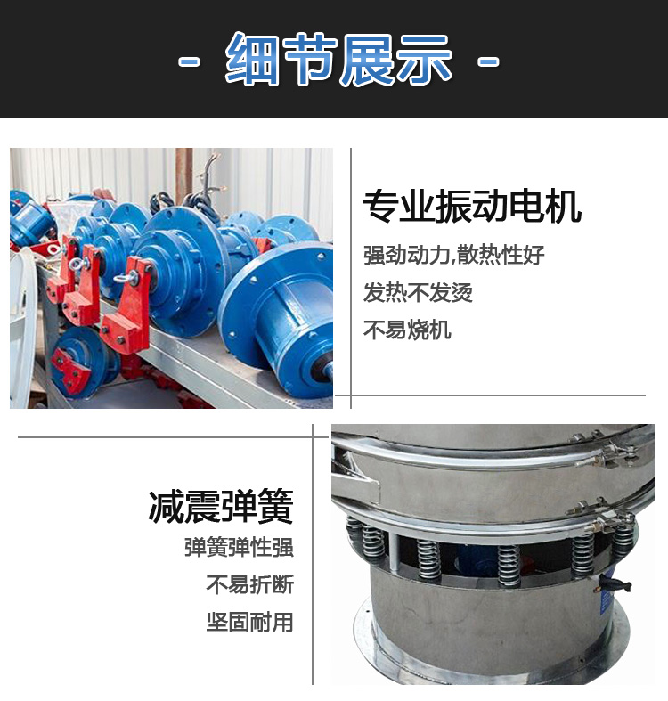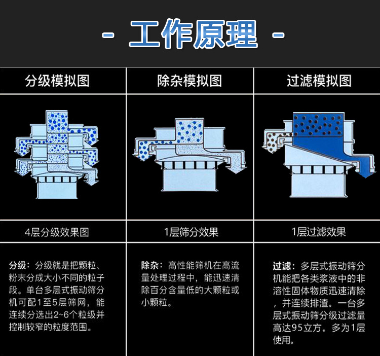 粉末顆粒振動篩的運動軌跡是一條復雜的三維曲線。水平面上的投影是圓,在兩個垂直面上的投影是兩個相同的橢圓。通過調整振動電機上下端偏心塊的相對相位,可以改變物料在篩面上的運動軌跡,從而達到不同的篩分目的;適用于面粉、淀粉等粉狀物料和各種顆粒狀物料的篩分。