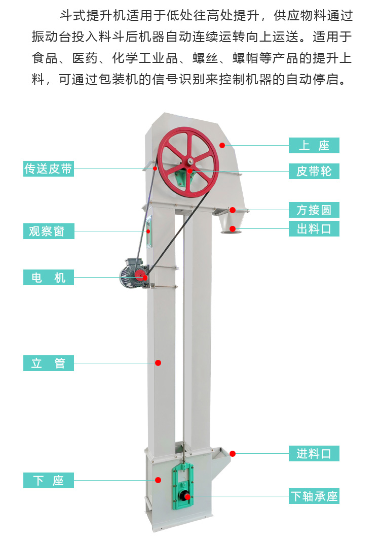 TD/TH型斗提機適用于從低到高的提升。輸送速度可根據輸送能力進行調整,提升高度可根據需要選擇。適用于食品、醫藥、化工產品等產品的提升;它分為三種類型:環鏈、板鏈和皮帶。